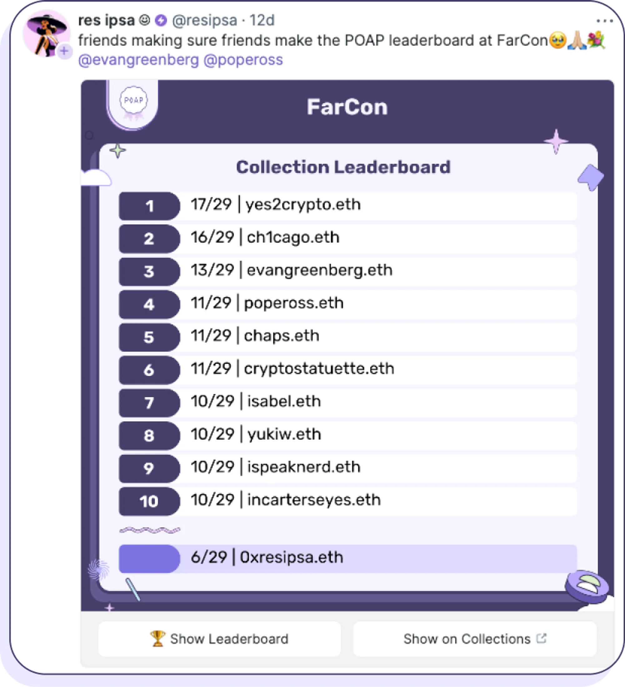 We set up a leaderboard on Warpcast, Farcaster's main social platform, to highlight the top POAP collectors at FarCon. Attendees were encouraged to share their rankings, which fostered friendly competition and boosted engagement. The contest was a photo finish, with the top collector acquiring 17 of the 29 POAPs available on site.