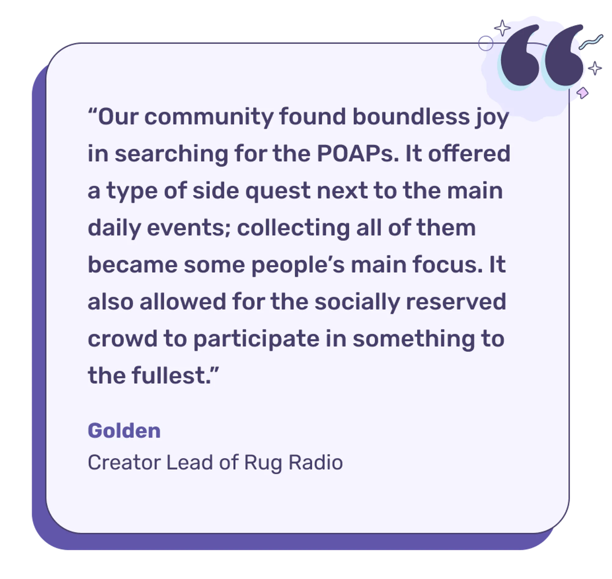 The Rug Radio mission was to create a truly enchanting experience for guests, many of whom had not met before IRL. With this in mind, Rug Radio and POAP facilitated social connections through the shared activity of a POAP scavenger hunt, fostering engagement and forging new relationships within the community.